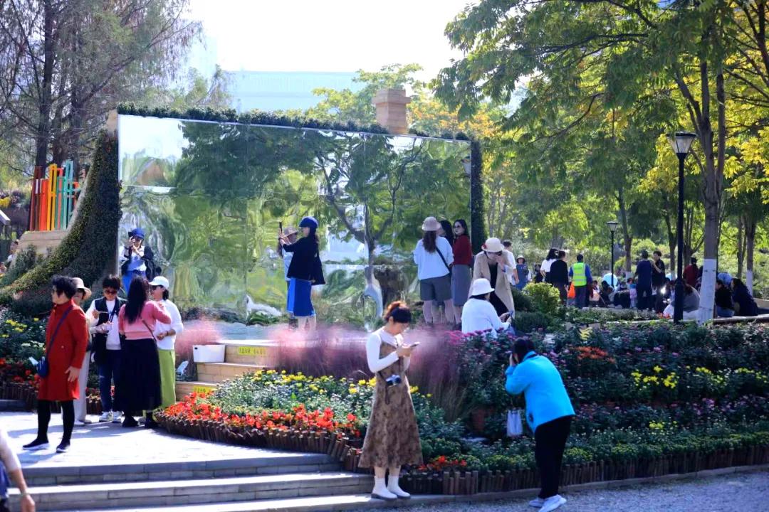 在“鏡中菊影”景觀區(qū),游客踏入“天空之境”,恍若步入鏡花水月之境,與濱湖風(fēng)光相映成趣。